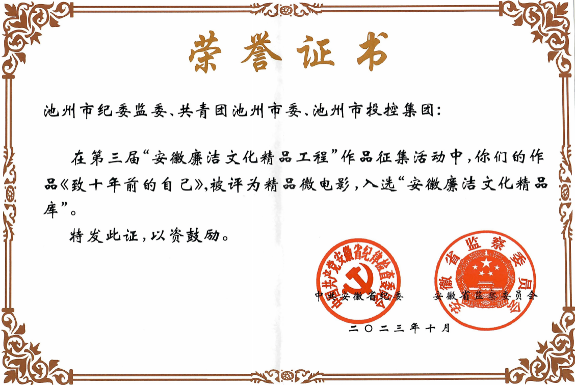 據(jù)悉,在第三屆“安徽廉潔文化精品工程”作品征集活動(dòng)中,池州市紀(jì)委監(jiān)委、共青團(tuán)池州市委、池州市投控集團(tuán)聯(lián)合攝制的廉潔微電影《致十年前的自己》,被評(píng)為精品微電影,入選“安徽廉潔文化精品庫(kù)”。