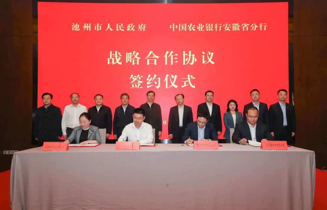 10月12日下午,池州市政府與中國農(nóng)業(yè)銀行安徽省分行舉行戰(zhàn)略合作協(xié)議簽約儀式。簽約儀式上,池州市政府與中國農(nóng)業(yè)銀行安徽省分行簽訂《戰(zhàn)略合作協(xié)議》;集團(tuán)旗下產(chǎn)業(yè)發(fā)展基金有限公司、農(nóng)銀金融資產(chǎn)投資有限公司、合肥博軒私募基金管理有限公司、安徽江南新興產(chǎn)業(yè)投資有限公司共同簽訂《農(nóng)銀國軒新材料基金合作框架協(xié)議》。