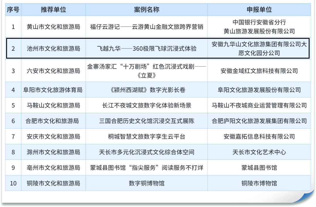 12月26日,安徽省文化和旅游廳公布2023年數(shù)字文旅創(chuàng)新實踐十佳案例名單,集團所屬大愿文化園分公司申報的項目“飛越九華——360極限飛球沉浸式體驗”榜上有名?。。?/p>