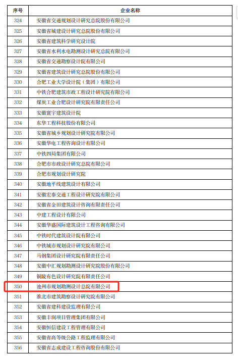 4月10日,安徽省住房和城鄉(xiāng)建設(shè)廳發(fā)布了《關(guān)于對(duì)2022年度安徽省建筑業(yè)龍頭骨干企業(yè)進(jìn)行表?yè)P(yáng)的通報(bào)》,集團(tuán)所屬池州市規(guī)劃勘測(cè)設(shè)計(jì)總院有限公司榮登榜單。